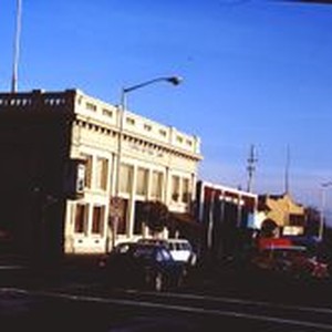 Slide, color transparency: The Sierra National Bank in Sebastopol at 101 South Main Street. The red Sebastopol Times building is seen to the right and Joe's Budget Store is at the corner of South Main and Burnett Street. February, 1977