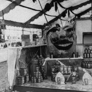Photo--black and white, from Borba 8" x 10" celluloid negative: Gravenstein Apple Show display of a section of the Standard Oil of Company of California showing Oronite Fly Spray in cans with a large papier mache apple. To the right a display of Spark stoves and ranges. about 1930. Hand scratched at bottom of photo "Borba Photo."