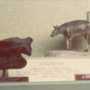Plaster cast of a skull and lower jaw of an extinct animal that lived during the Eocene epoch.