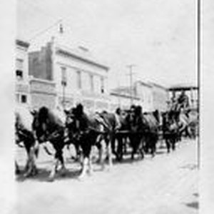 Photo--black and white: Santa Rosa Carnival Parade, May,1910. Ponies pull a large wagon.