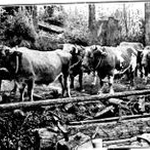 Team of oxen hauling logs at Camp Meeker California near the Russian River, 1907. The oxen were used during the summer months hauling logs to the saw mill located in Camp Meeker just above the office.