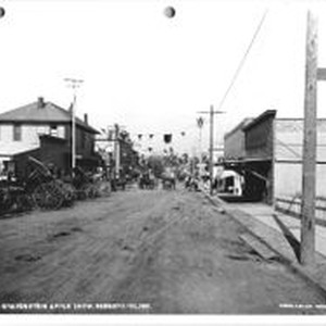 Photo--black and white, blow up of postcard: Bodega Avenue looking east in Sebastopol 1911 and celebrating the Gravenstein Apple Show of that year. Bodega is a dirt road with horse drawn buggies in the road. Caption on photo: "No. 42. Gravenstein Apple Show, Sebastopol, 1911 Turrill & Miller Photo, S.F."