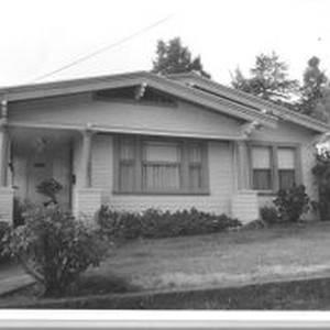 Photo, black and white: Sebastopol house at 7223 Maple Avenue a California Bungalow built in 1915 in the Laguna Vista Addition. House photographed in 1993 by Evelyn McClure for her book "Sebastopol, California : History, Homes and People."