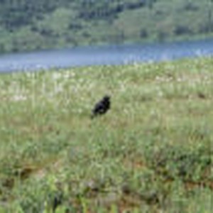 A raven standing in some grass.