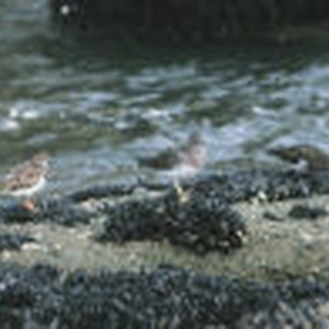 A ruddy turnstone, a surfbird, and a black turnstone standing near a creek.