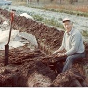 Photo--color: Morita apple Ranch in Sebastopol. Kichizo Morita harvesting burdock in February 1978. Morita sits on the ground near a long ditch and holding burdock--a herb. Alice Kashiwagi is Kikue and Kichizo Morita's daughter.