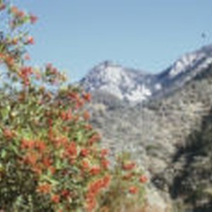 Close-up of red berries with mountains in background.