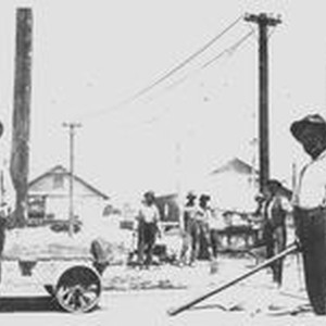 Photo--black and white: P&SR railway work crew on Main Street Sebastopol. The Garcia and Maggini and Co. building, apple processors, in right background. The stone Powerhouse is in the left center background. Circa 1904