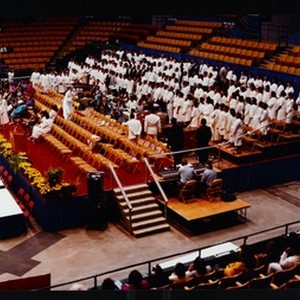 Photograph of a large group of women dressed in white on stage at a Church of God in Christ national convention, [s.d.]. "example of our stage from year to year" -- written on back. [Description English/roman)]