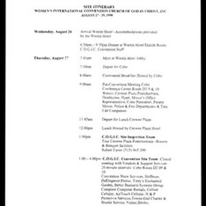 Planning documents for the upcoming 49th Annual Women’s International Convention, Church of God in Christ, Detroit, Michigan, 1999 May 24-28. Includes a site itinerary (1998 August 27-29, 2 copies), an agenda (for a pre-convention meeting, 1998 August 27), schedule (for vendor meetings, 1998 August 27), a schedule (for hotel site inspection, 1998 August 27-28), an agenda (1999 February 8), and a list (of co-host jurisdictions). [Description English/roman)]