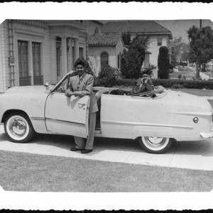 Nowland Hong (left) and Roger Hong (right) are posing for a photo with Nowland's first car. Hong family papers. The Huntington Library, San Marino, CA.