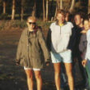 Students Su Burr, Brian Hudgens, Stewart Gillmor, Kathryn Crampton, and Julie Hagelin, stand on shore in the early morning waiting for their boat.