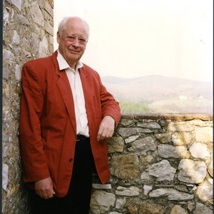 Color photo of Charles Handy outside near a stone wall, taken by Elizabeth Handy. Charles appears with his left arm on top of a stone balcony ledge. He is gazing directly into the camera lens.
