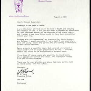 L.H. Ford (Church of God in Christ), letter, 1994 August 2, Memphis, Tennessee, to "beloved supervisor". [Description English/roman)]