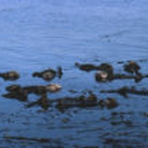 A raft of sea otters resting in the water.