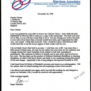 Letter of correspondence from Roger Harrison to Charles Handy expressing thanks for Handy's offer to review Harrison's Collected Papers, November 20, 1994; Charles Handy Papers; Box 9, Folder 18; 1 page