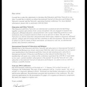 Chris A.M. Hermans (International Journal of Education & Religion), letter, [s.d.], Department of Practical Theology, Catholic University of Nijmegen, Erasmusplein 1, Nijmegen, 6525 HT, Netherlands, to "scholar". Enclosed is informational sheets on the Education and Ethos Network. [Description English/roman)]