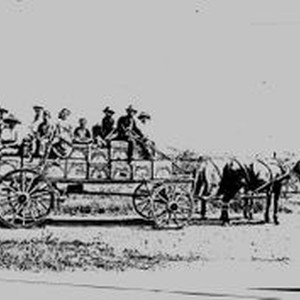 Photo, black and white: Caption on verso of picture: The Barlows "returning from the Marshall Ranch berry fields--Mr.. Turner, Manuel Mortiz driving. Mother Barlow, Denman, Louise, Wilbur, Leland and Aid boy (Children's Aid Society) with little Harvey _