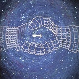 Soviet poster dedicated to the Apollo Soyuz Test Project (ASTP) conducted in July 1975. Captions read, "Союз-Аполлон. Apollo-Soyuz / Soyuz-Apollon. Apollo-Soyuz". [Description English/roman)]