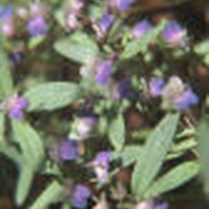 Close up of tiny violet colored flowers with small thin green leaves.