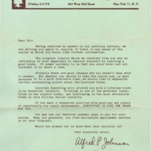New York Mergenthaler Linotype School, letter, ca. 1956, to Blaine Young regarding Linotype School. [Description English/roman)]