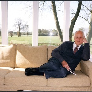 Color photo of Charles Handy lying inside on a sofa next to a window, taken by Elizabeth Handy. Charles is gazing directly into the camera lens. His left hand is propping up his face, and a thin book is in his right hand.
