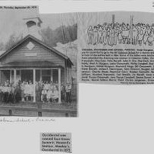 Photo--black and white--newspaper clipping: Coleman Valley School, Occidental reunion in 1979. The school was built in 1864. The former students are standing on the porch of the Coleman Valley School and include: Sturgeon, Ralph Franceschi, Pasquale Calvi, Rico Morelli, Felix Illia, John E. Clark, Skip Speckter, Ernie Hardy, Ralph Sturgeon, Merl A. Chenoweth, Leslie Campbell, Phillip Chenoweth, Dub Sturgeon, Ralph S. Sturgeon, Daniel Feige, Raymond Chenoweth, Bill Giovannini, Edwin Morelli, Frank, Henningsen, James E. Chiaroni, Sam Johnson, Douglas Giovannini, Lewis Shook, Charlie Calvi, Raymond Gonnella, Rueben Gonnella, Ben LaPham, Jess Franceschi, Humbert, Beedle, Carl, Morelli, Vic Arnold, Irene Martinson Chenoweth, Jewel Thorpe Campbell, June Thorpe Donati, Denisio Thorp, Amanda Yarbrough Morris, Bessie Gibson Jorgensen, Pearl Christy Smythe, Grace Beedle. Occidental was named four times: Summitt, Howard's Station, Meeker's and finally Occidental in 1875. Photo from collection of Ralph Sturgeon.