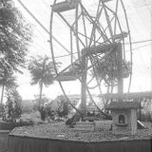 Postcard--black and white: A 1912 Gravenstein Apple Show exhibit of a Ferris Wheel made of apples.