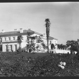 View of the southwest corner and south terrace of the residence, seen over the blooming rose garden. Writing in white on lower left side of picture reads "C 1793." MS note on verso reads "Rose garden, about 1911." Stamp on verso reads "Photographs from Frederick W. Martin, 60 E. Colorado St., Pasadena, Cal."