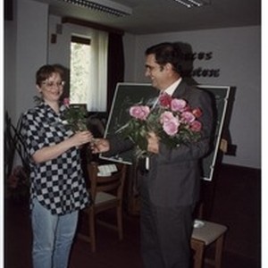 Photograph of Mihael Kuzmič giving a rose to a student after the end of a course. [Description English/roman)]