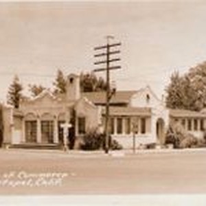 Postcard--black and white: The Chamber of Commerce building built in 1923 at the corner of Sebastopol and Petaluma Avenue (Highway 12 and Petaluma Avenue). The building was landscaped by Luther Burbank. Lumber company sign seen in right background. Caption: Chamber of Commerce Sebastopol, Calif." Vintage auto about 1915 at far left with about 1930-40's cars behind it. Rotary International sign in front near power pole. BACKGROUND: The Chamber of Commerce, organized in 1921, contributed immeasurably to the growth of the city by conducting beautification projects, erecting street signs, establishing the first auto park and organizing the California Gravenstein Apple Growers.