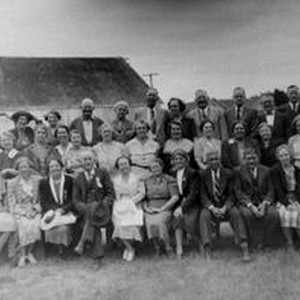 Photo--black and white, from Borba 8" x 10" celluloid negative: A large group of adults posing for a photo outdoors. Possibly this is the Borba family or Borba family reunion as William (Bill) Borba is the seated man on the right.