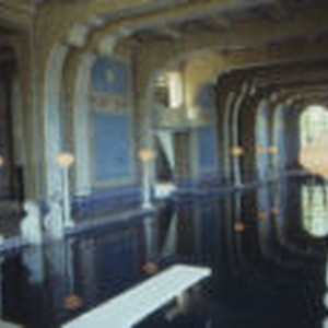 Ornate blue and gold mosaic tile covers the walls of the indoor pool at Hearst Castle.