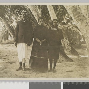 Missionary Semisi Nau, his wife Matelita, and daughter Akosita stand under palm trees facing camera. Title transcribed from envelope. Date devised by cataloger. . Verso of photo reads: "Missionaries Simisi (Tongan) Martha Lita [sic]. Tongan missionaries at small atoll named Lord Howe called part of Solomons but more human original, or another Lord Howe somewhere near Australia."