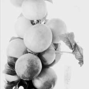 Photo, black and white: Branch with plums. Handwritten on back: "Plums B-18 "Large Flat Ruby" (west limb of east branch) Photographed July 1929."
