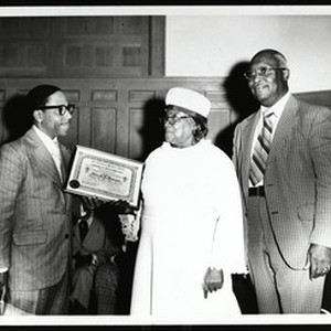 Photograph of Emma F. Barron receiving the honorarium citation of special commendation from the Church of God in Christ Religious Worker's Guild, 1974. "C.C. Owen, Mother Barron, Supt. C.J. Jone" -- written on back. "A.B. Bell Photograph Service, 1435 E. Red Bird Lane, Dallas, Texas 75241, FR6-2244" -- stamped back. [Description English/roman)]