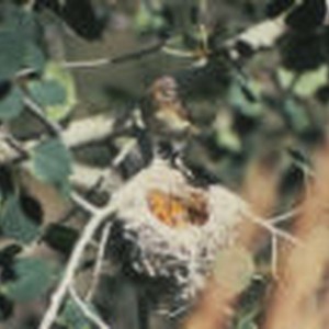 A warbling vireo near its nest and chicks.