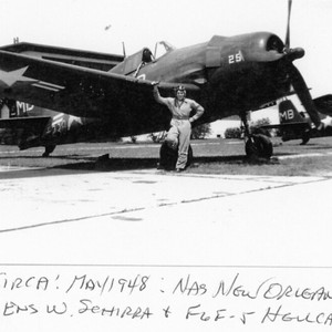 Pictionid72429178 - catalogschirra00077 - title-schirra collection-circa may 1948 nas new orleans ens w schirra and f6f-5 hellcat - filenameschirra00077.tif-Item from the Wally Schirra Collection on loan from the Schirra Estate. ----Repository: San Diego Air and Space Museum Archive