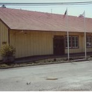 Photo--color: Duncans Mills downtown--building with California and US flags.