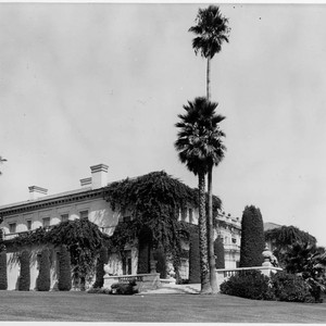 A view of the southern and western façades and the south terrace of the Huntington residence, with topiaries on the lawn and terrace and vines growing on the residence. MS note on verso reads "HEH residence, south and west facades."