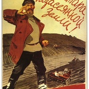 A poster showing a peasant (or a collective farmer) in the foreground. In the background, a number of pulling ploughs tractors and horse-driven sowing machines can be seen operated by peasants (collective farmers). The caption reads, "Ni odnogo gektara nezaseiannoi zemli!' meaning "Nor a single unsown hectare must be left!". [Description English/roman)]