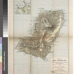 Kirkpatrick Catalogue entry: "2435 i Baumann, O. Karte der Insel Fernando Póo, nach eigenen Aufnahmen konstruiert und gezeichnet... mitglied der Prof. Dr. Lenz'schen Expedition nach Aequatorialafirka 1885-87. Gotha, Justus Perthes, 1887. 1 sheet. (Vienna, 21 Nov. 1887). [see p.]."MS note: "To Sir Richard and Lady Isabel Burton most respectfully dedicatied by the author, Vienna 21/IX/87.""Die Küstenlinie mit Berücksichtung der englischen Seekarte, die Spanische Nomenklatur nach Don Julian Pellon y Rodriques." Submap: Plan vin Santa Isabel. MS note from author.. Prime meridian: GM. Relief: shaded. Graphic Scale: Kilometers. Projection: Cylindrical. Printing Process: Lithography. Other Features: Sub-maps. Verso Text: Stamp: Kensington Public Library (6) MS notes: R.B. 11489,u. P. Maps Africa Baumann 2435 Sticker: R.B. 11489,u..