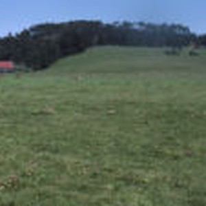 A lush green meadow rolls upwards towards a hill with cows, and an old barn in the distance.