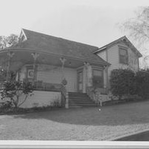 Photo, black and white: Sebastopol house at 7235 Hayden Street a Queen Anne style built in 1900 on the Martin Litchfield Ranch--known as the Litchfield House House photographed in 1993 by Evelyn McClure for her book "Sebastopol, California : History, Homes and People."