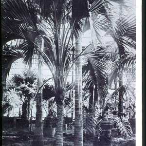 The label that accompanies this photo in the album reads "No. 105 Collection of palms and other sub-tropical plants in the large lath-house. About 1912."