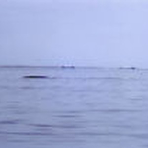 A whale swimming near the surface of the water at Scammon's Lagoon with salt barges in the background.