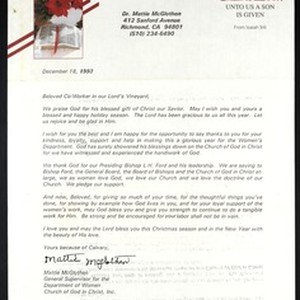 Mattie McGlothen (Church of God in Christ), Richmond, Virginia, letter, 1993 December 18, to "beloved co-worker in our Lord's vineyard" (Church of God in Christ). [Description English/roman)]