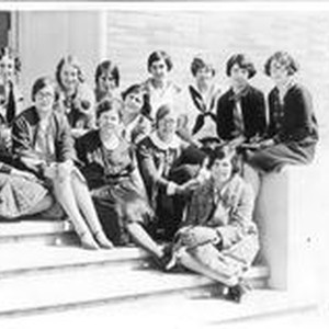 Photo, black and white: Group photo of school girls with teacher of the Girl's Student Affairs in 1927 for the yearbook Azalea. Teacher Ms. Davis in middle of first row. Top row: 5th from left, Lillian Jacobson and 6th from left Leona Singmaster. The Girl's Student Affairs Code--- They Will not: A ttract attention by indiscreet dress or conduct N eglect courtesy toward fellow students or teachers A pprove of excessive use of cosmetics L ower school standards by unkind remarks Y ield to temptation of telling untruths G ive anyone cause to criticize their school I nvite familiarity R espect those who do not uphold Analy standards L ower themselves by telling suggestive stories, drawings or showing pictures S teal Analy Girls Will: A void using profane langauge S eek all possible knowledge, knowing they are here for that purpose S incerely uphold the constitution of Analy N ever shirk or complain about necessary tasks.