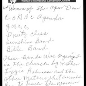 Handwritten minutes for the 54th Annual women's international convention/crusade, Church of God in Christ, 2004. [Description English/roman)]