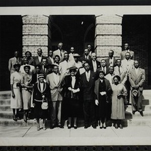 Photograph of Arenia C. Mallory in graduating garb with a group of people on the steps at Lane College, Jackson, Tennessee, 1960. [Description English/roman)]